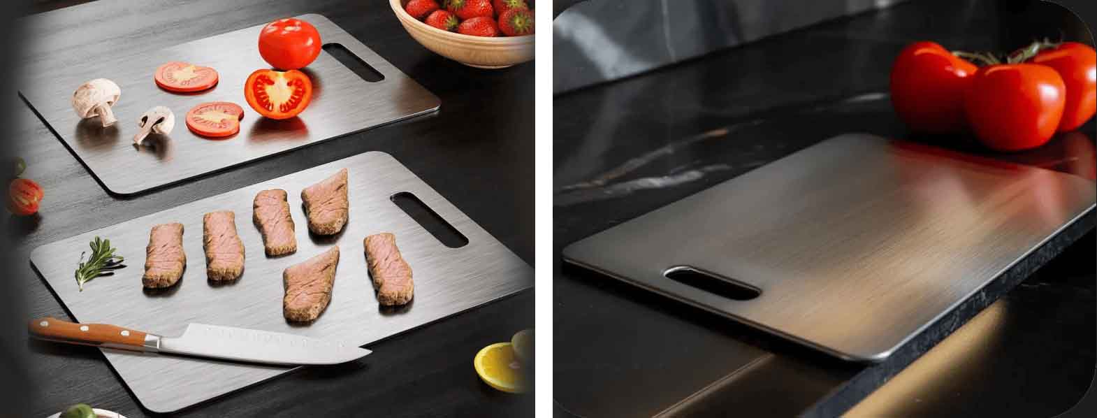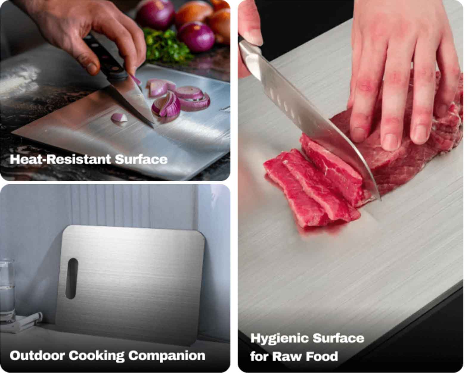 Titan Carve isn’t just another cutting board—it’s a game-changer. Engineered from high-quality stainless steel and coated with titanium, it’s designed to eliminate the vulnerabilities that come with wood and plastic. With a surface so hard that your knives won’t cut into it, there’s simply nowhere for bacteria to hide.